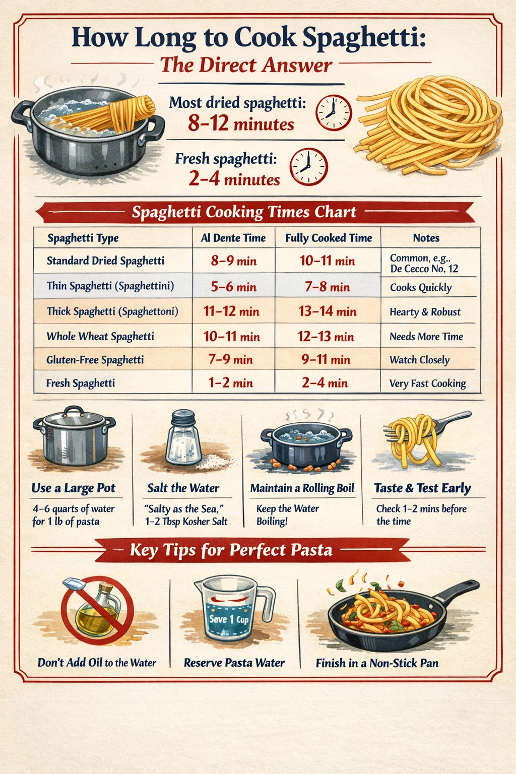 A legtöbb szárított spagetti kerül 8-12 perc forrásban lévő sós vízben főzni, a vastagságtól és a kívánt állagtól függően. Az al dente – az olasz konyha aranyszabványa – esetében törekedjen a csomagtartomány alsó végére, általában 8-9 percre. A friss spagetti sokkal gyorsabban megsül, jellemzően csak 2-4 perc . A teljes kiőrlésű spagettinek gyakran teljes 10-12 percre van szüksége, hogy megfelelően megpuhuljon anélkül, hogy gumiszerűvé válna.