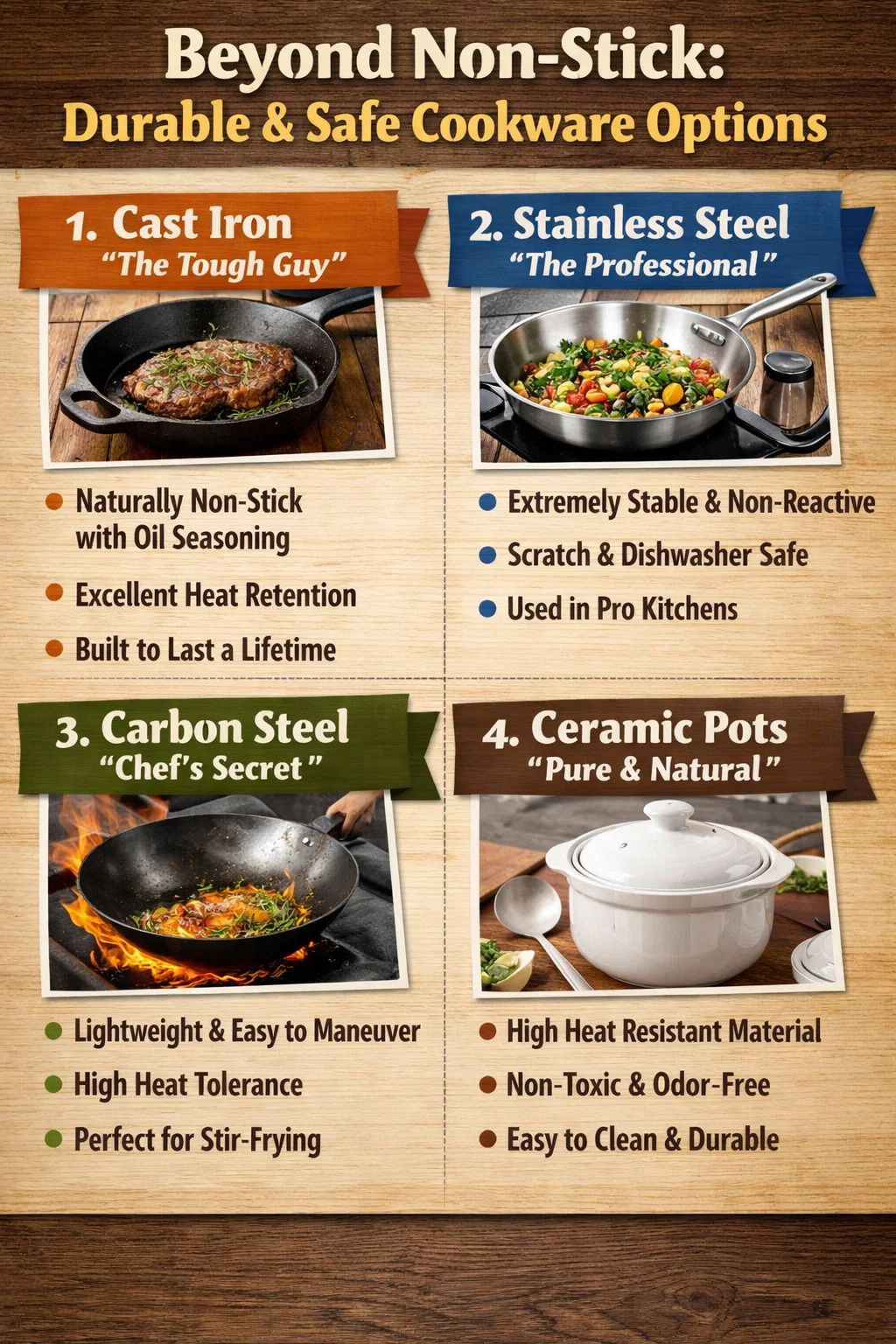 Miközben modern tapadásmentes edények Normál használat mellett biztonságos, ha olyan edényt keres, amely teljesen gondtalan, és nem kell aggódnia a bevonat hámlása vagy a magas hőmérséklet miatti problémák miatt, akkor valóban számos robusztusabb és megbízhatóbb alternatíva létezik.